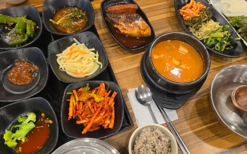 식탁 위에는 돌솥에서 갓 지은 따뜻한 밥이 중심이 되고, 여기에 시금치나 시래기 볶음, 도라지무침, 열무김치 등 다양한 나물과 반찬이 더해져 12첩 반상처럼 풍성하게 차려진다. 화려하지는 않지만 하나하나 손이 간 듯한 반찬 구성이 인상적이며, 집밥 같은 편안함을 느끼게 한다.