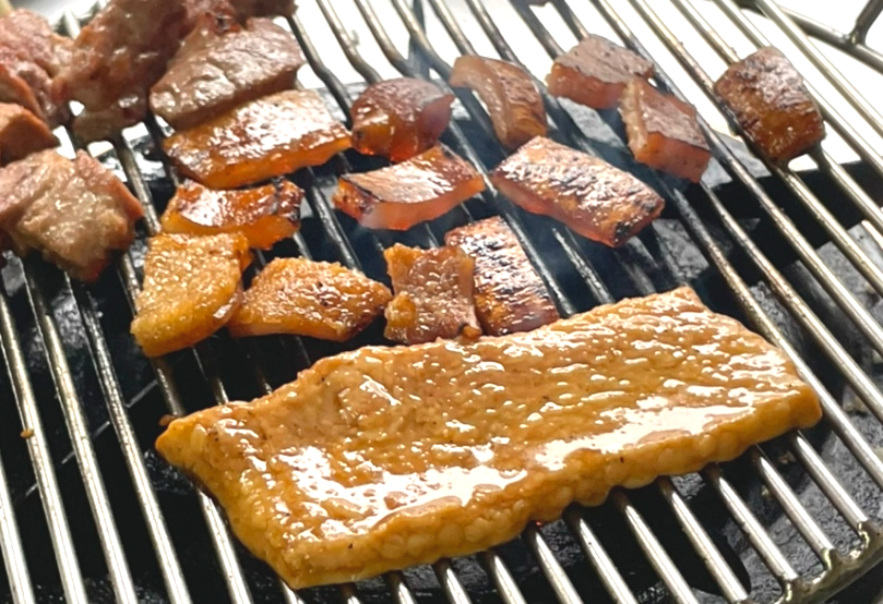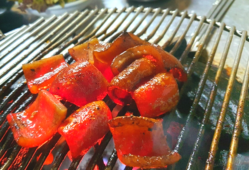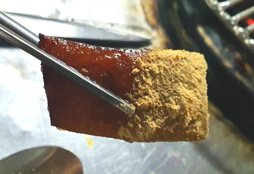 특히 돼지껍데기는 쫄깃한 식감과 고소한 맛이 잘 살아 있어 인기가 높으며, 콩가루에 찍어 먹으면 풍미가 더욱 깊어진다.